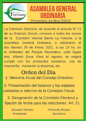 Convocatoria Asamblea Anual Ordinaria: Viernes 29/01/2021 - Hora 19_ Anfiteatro de Parque Recreativo
